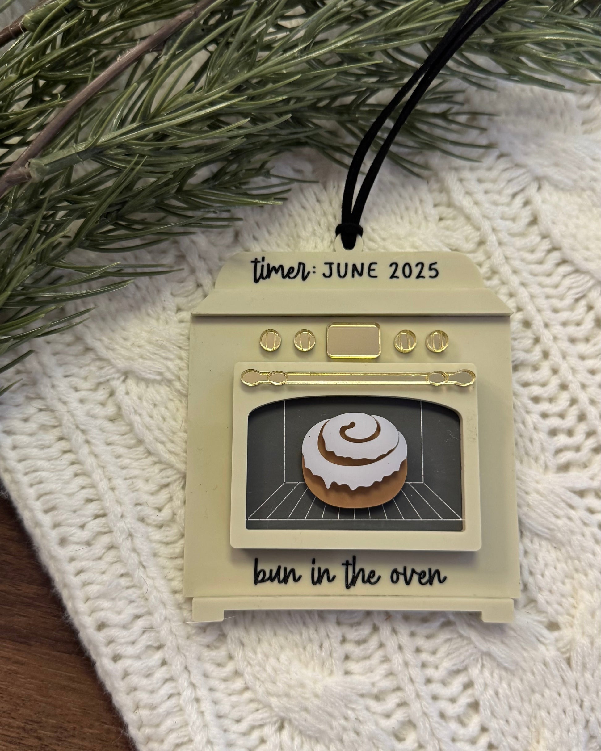 Celebrate the exciting news of your growing family with this unique "bun in the oven" pregnancy ornament! A great way to share your special moment with friends and family!