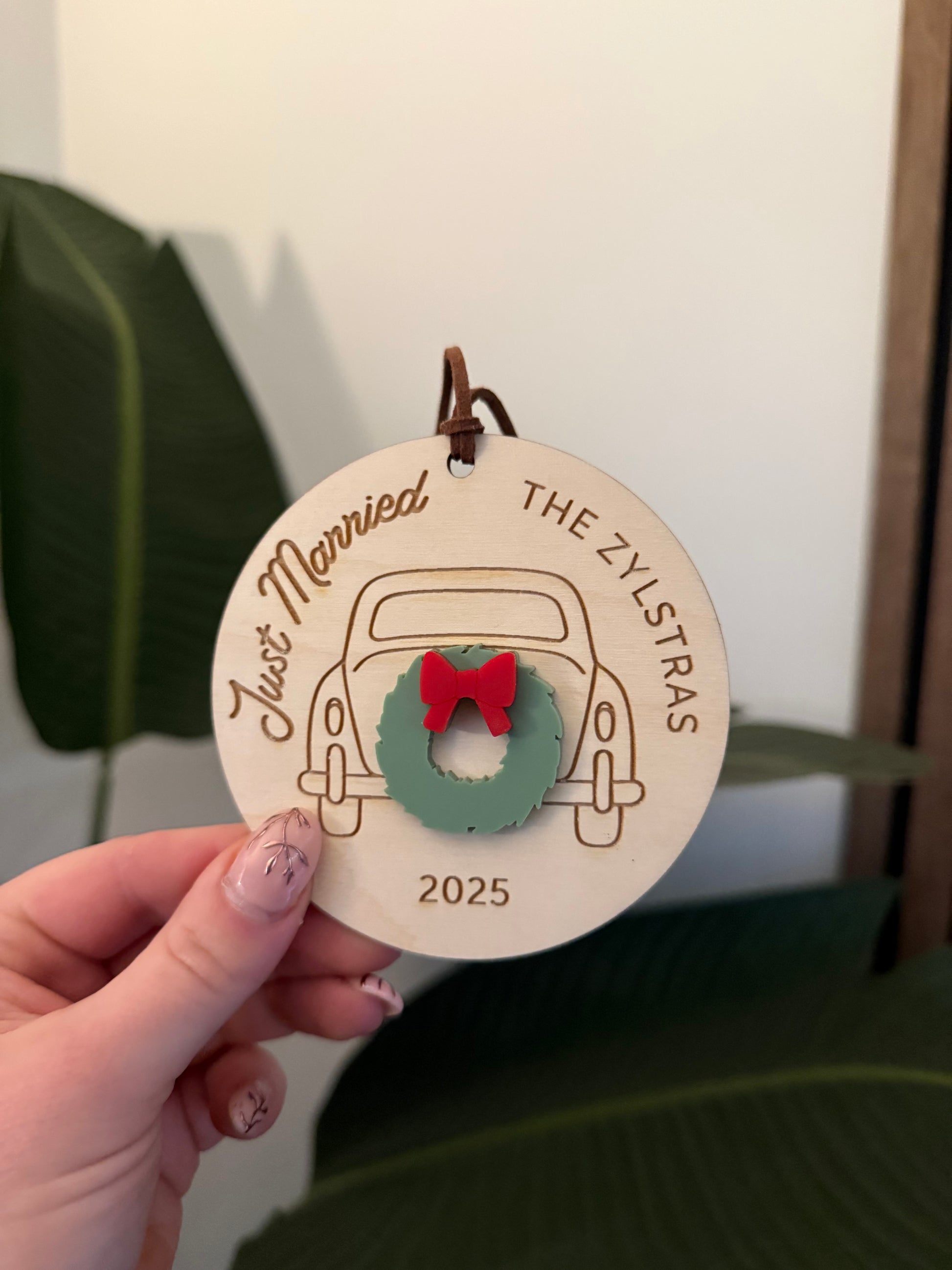 Celebrate your first Christmas as newlyweds with this handcrafted birch wood ornament. Features a cute engraved car design, 3D wreath and bow, and your last name + year. A perfect keepsake for your tree or a thoughtful gift for newlyweds.