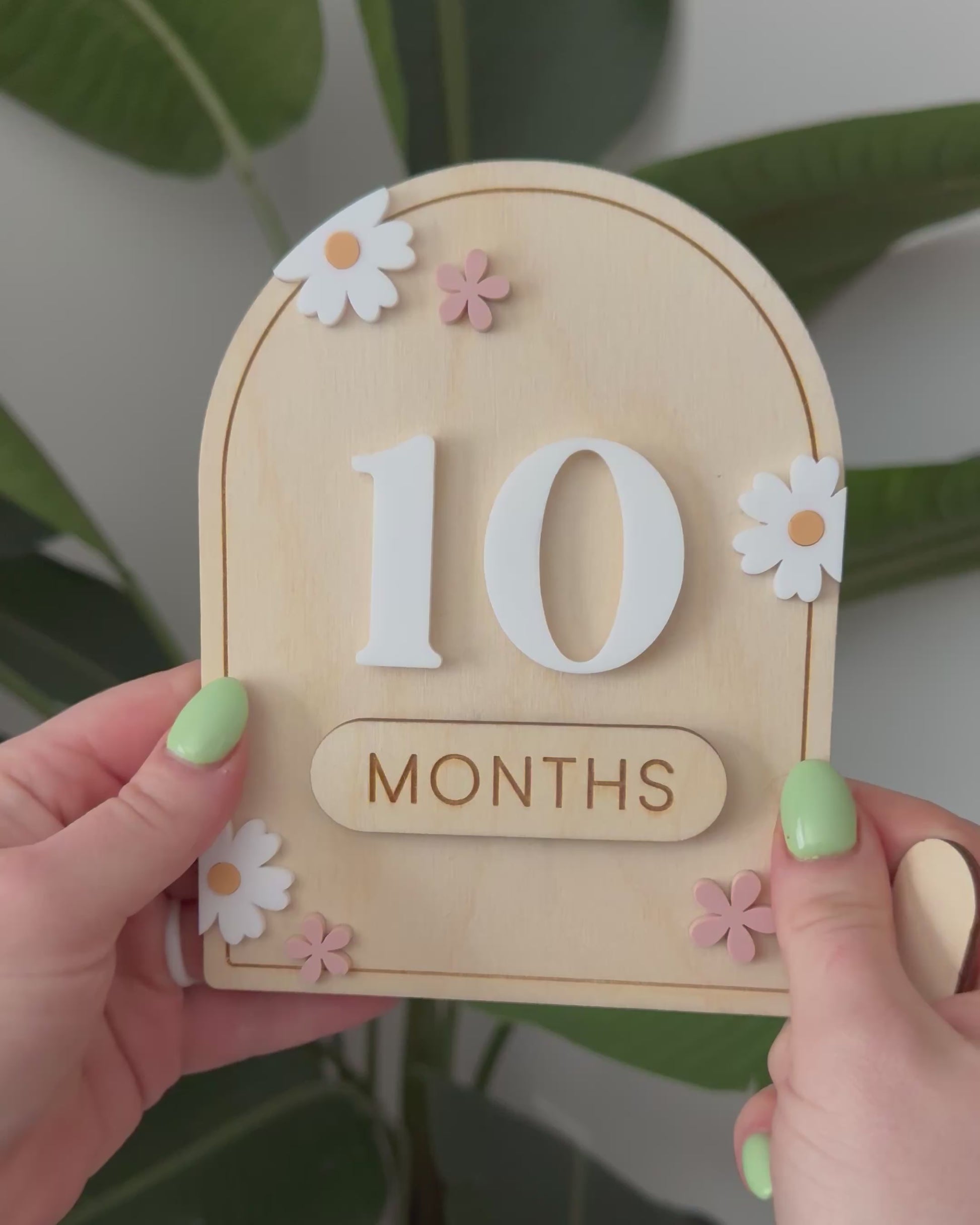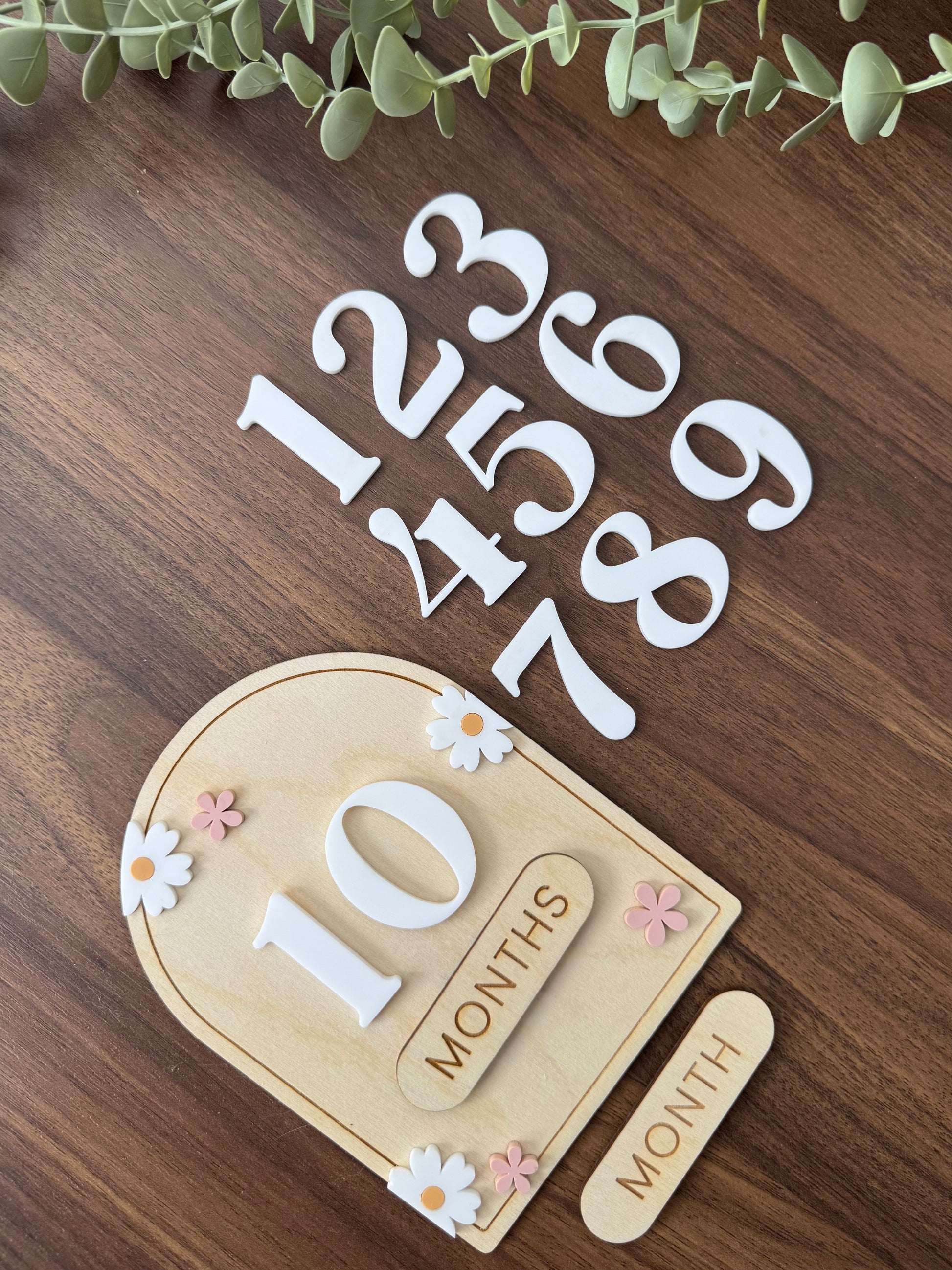 Celebrate your baby's growth with this beautifully crafted baby milestone plaque! Made from high-quality wood with elegantly engraved details, this timeless keepsake is perfect for capturing each precious milestone. It features interchangeable acrylic numbers and a magnetic "month" and "months" option, allowing you to effortlessly customize it for every stage of your little one’s first year.