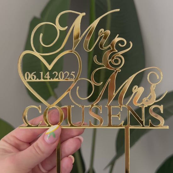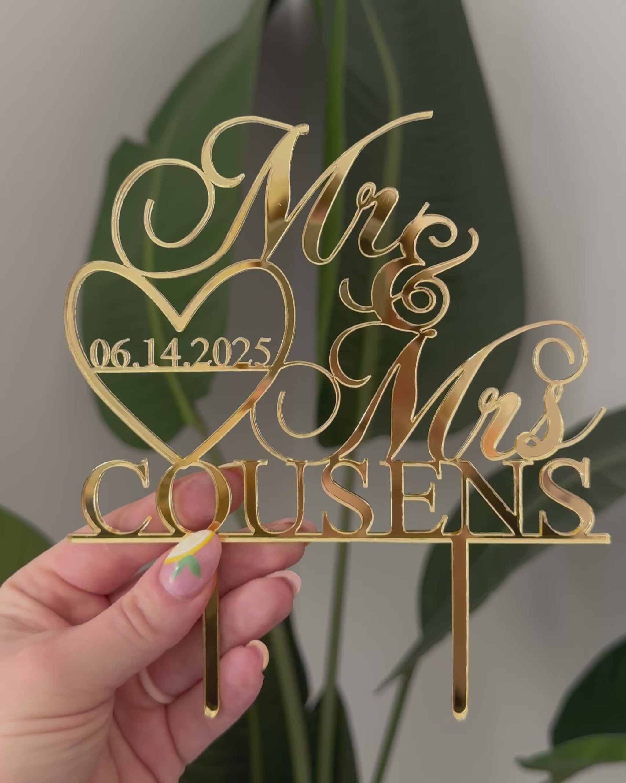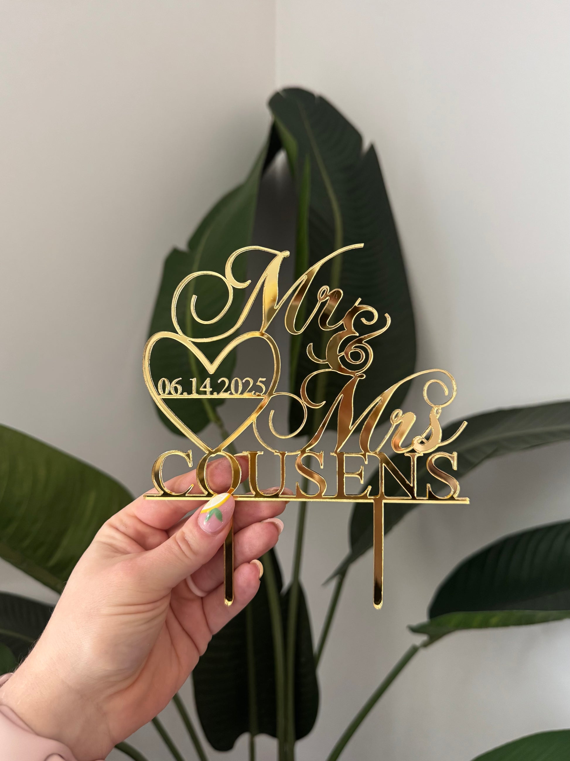 Celebrate your big day with a beautiful custom acrylic cake topper, featuring Mr & Mrs + your last name and wedding date! A perfect finishing touch for your cake and a keepsake you’ll love to hold onto for years to come.
