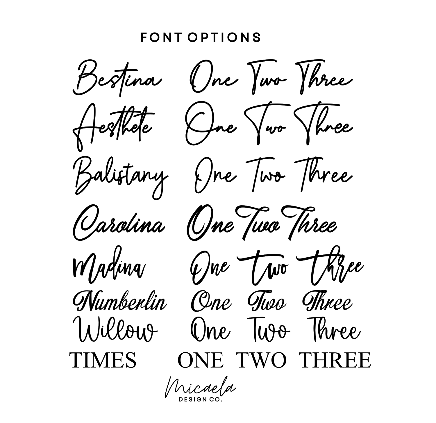 • Width varies by number and font (e.g., Madina font – “TwentyEight” is approx. 8.4" wide)